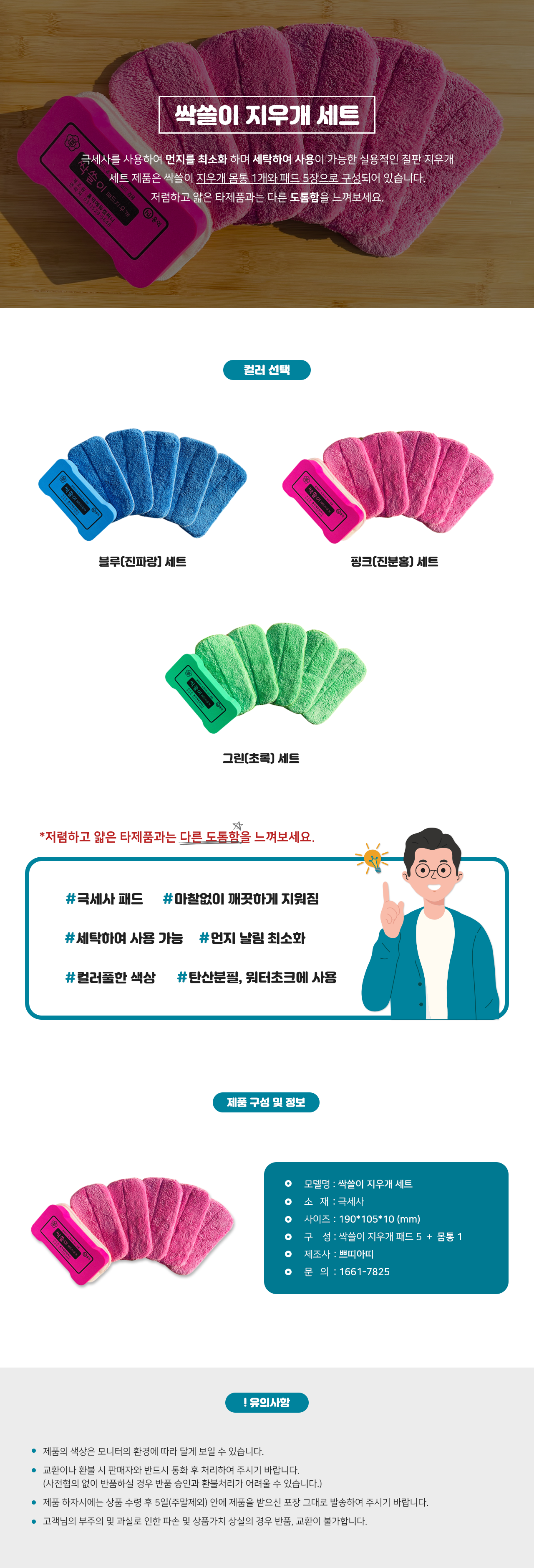 극세사를 사용하여 먼지를 최소화하고 세탁하여 사용이 가능한 싹쓸이지우개 패드와 몸통(몰드) 세트 입니다.